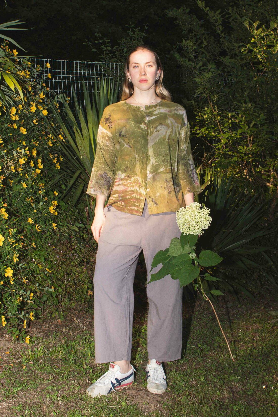 Chemise kaki pour femme en coton bio imprimée ALOE. Minimaliste et légère, toutes les finitions sont faites à la main, incluant les petites brides pour fermer les boutons. Elle célèbre la simplicité et la beauté des matières naturelles.